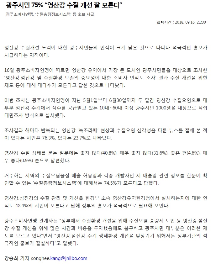 광주소비자연맹에서 10대~ 60대이상 광주시민 1,000명을 대상으로 영산강,섬진강 및 수질환경 보전의 중요성에 대한 소비자 인식도 조사를 실시하였습니다.