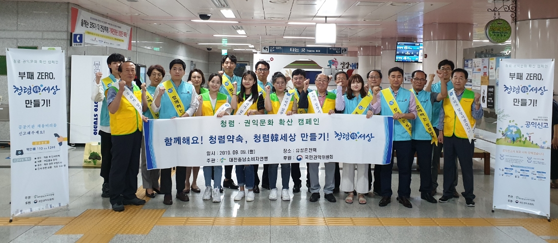 대전충남소비자연맹, ‘부패 ZERO, 청렴韓세상 만들기!’ 캠페인 진행 ![]() 대전충남소비자연맹(회장 강난숙)은 국민권익위원회(위원장 박은정)의 후원으로 6월 20일(목), 9월 9일(월) 유성온천역에서 국민건강보험공단 대전유성지사와 함께 대전 시민 1000여명을 대상으로 ‘부패 ZERO, 청렴韓세상 만들기!’ 청렴·권익문화 확산 캠페인을 진행하였다. 이번 행사에서는 공익·부패신고 관련 공익신고정의, 신고상담, 신고접수, 공익신고자보호제도 안내, 보상금 등 용기 있는 행동과 신고가 청렴韓사회를 만듭니다! 등에 대한 리플렛 배포와 배너 등을 전시하였다. 또한 청렴·권익문화 확산 동참 서명운동도 함께 진행하였다. 행사를 주관한 대전충남소비자연맹은 캠페인에 참여한 시민들이 반부패·청렴문화 확립, 대전지역에 청렴·권익 문화가 확산되고 청렴 환경이 조성되도록 자발적인 참여와 관심을 갖는 계기가 되었다고 하였다.